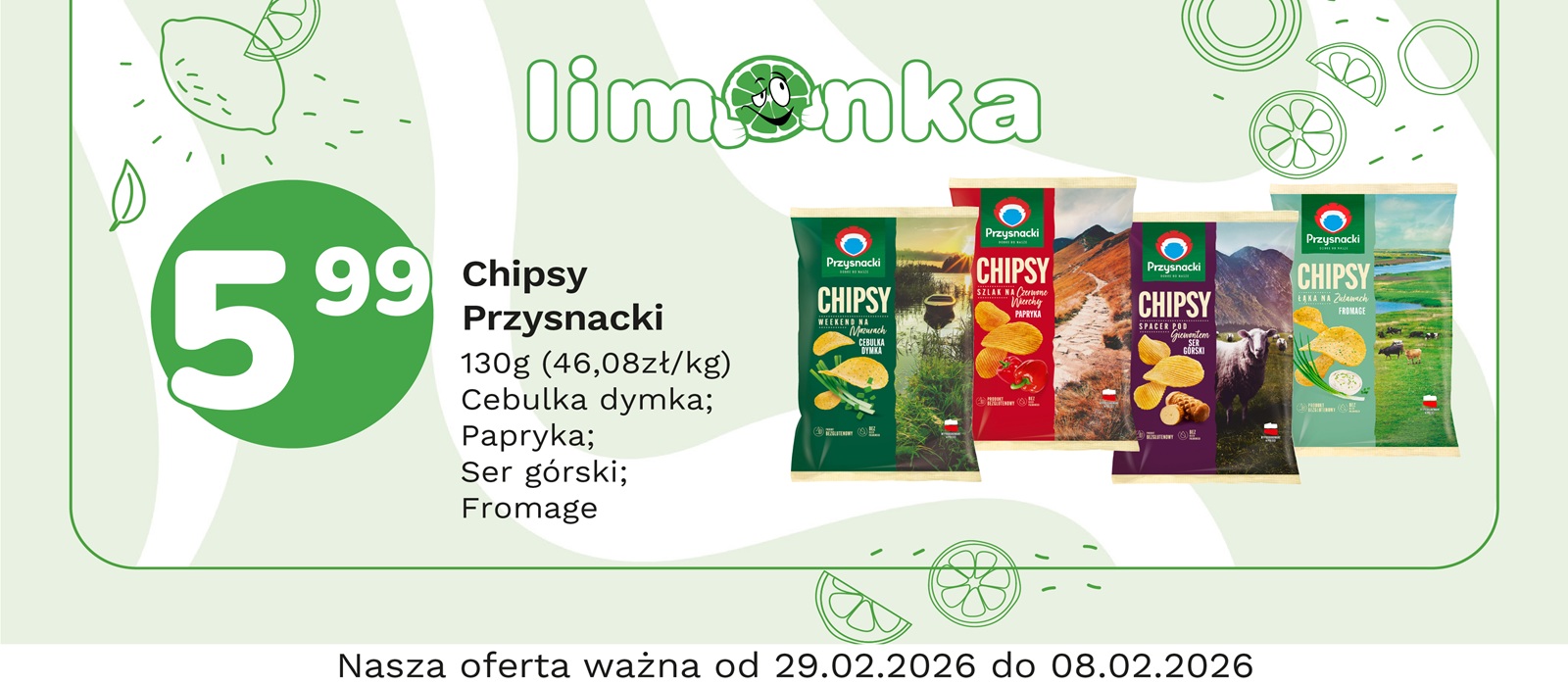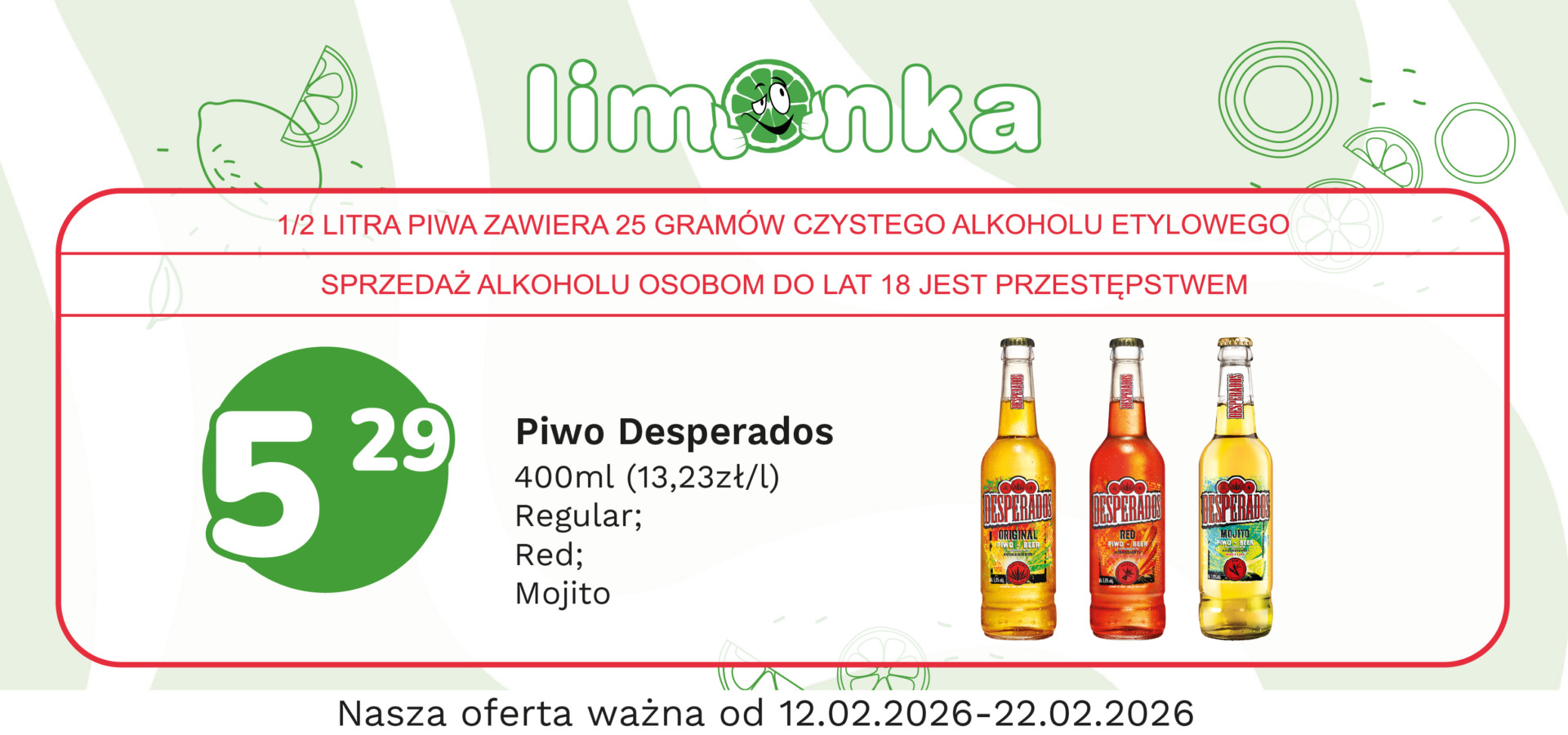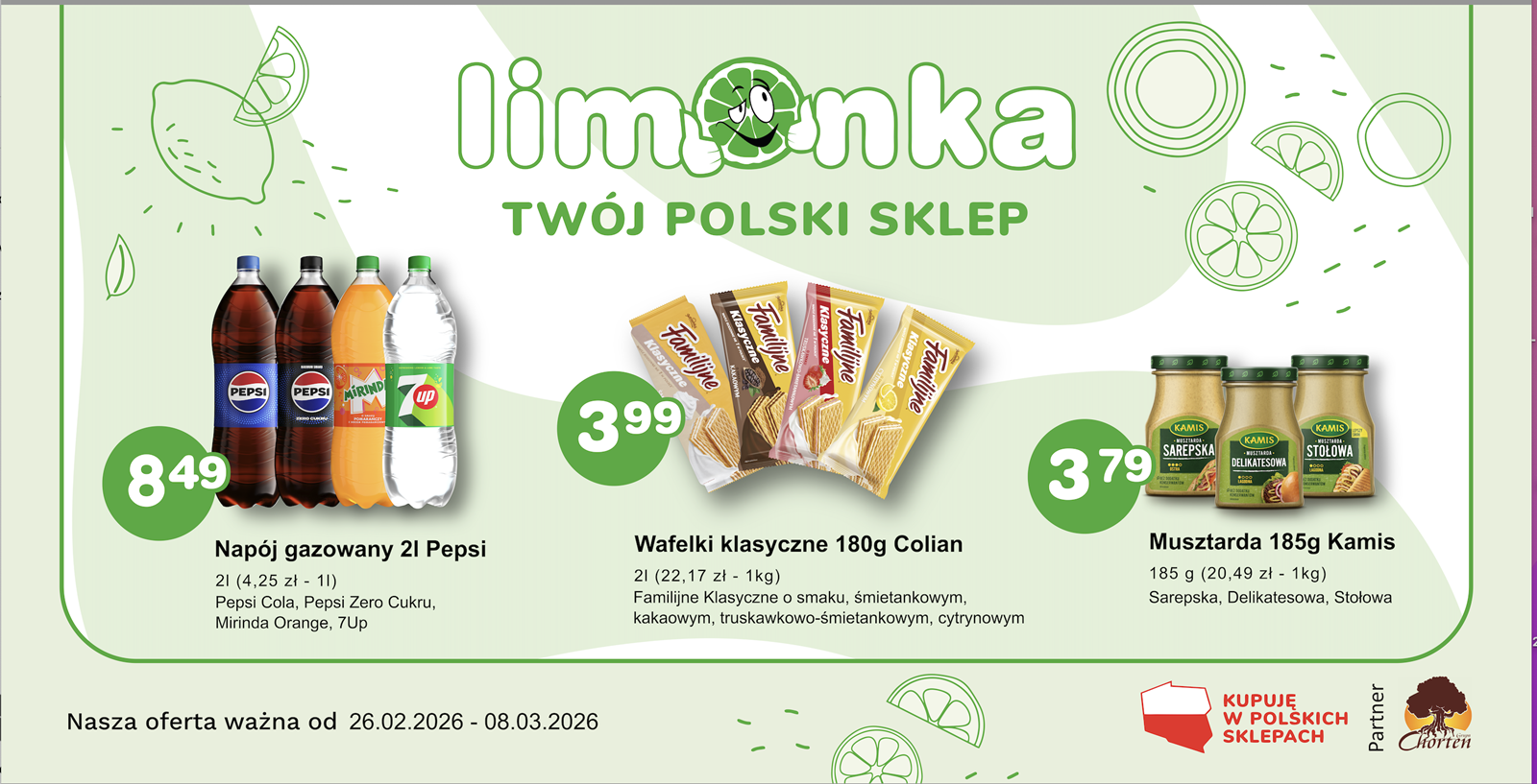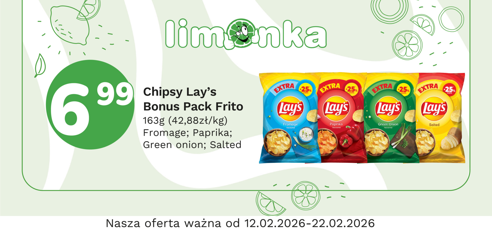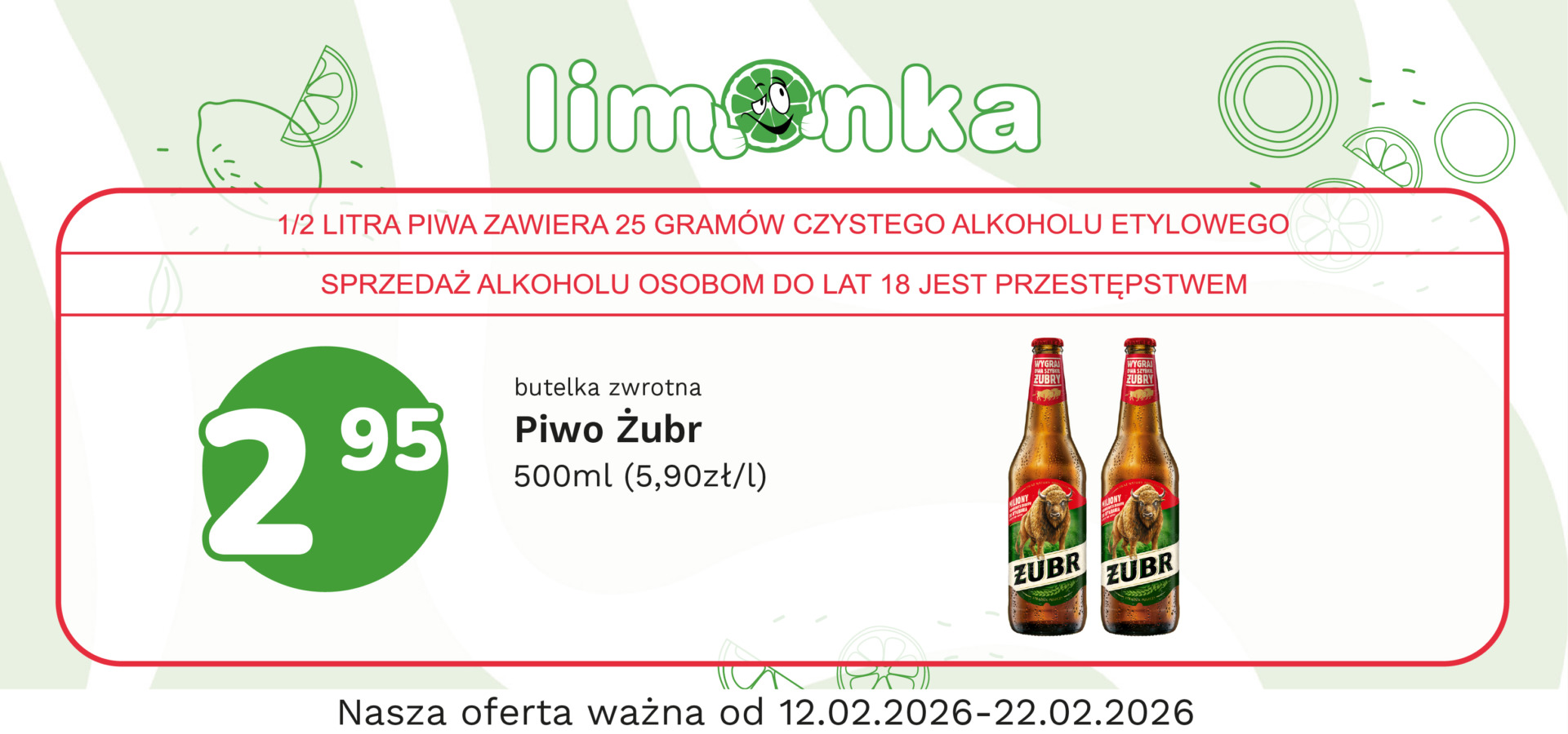 Limonka to w 100% polska sieć sklepów, prowadzona przez rodzimych przedsiębiorców. Oferujemy szeroki wybór świeżych produktów w atrakcyjnych cenach, dbając o ich najwyższą jakość. To miejsce, w którym codzienne zakupy stają się przyjemnością! Nasze sklepy są zawsze blisko Ciebie, oferując to, czego potrzebujesz na co dzień – korzystne ceny i różnorodny asortyment. Robiąc zakupy w Limonce, wybierasz komfort i pewność, że znajdziesz produkty idealne dla siebie i swoich bliskich.