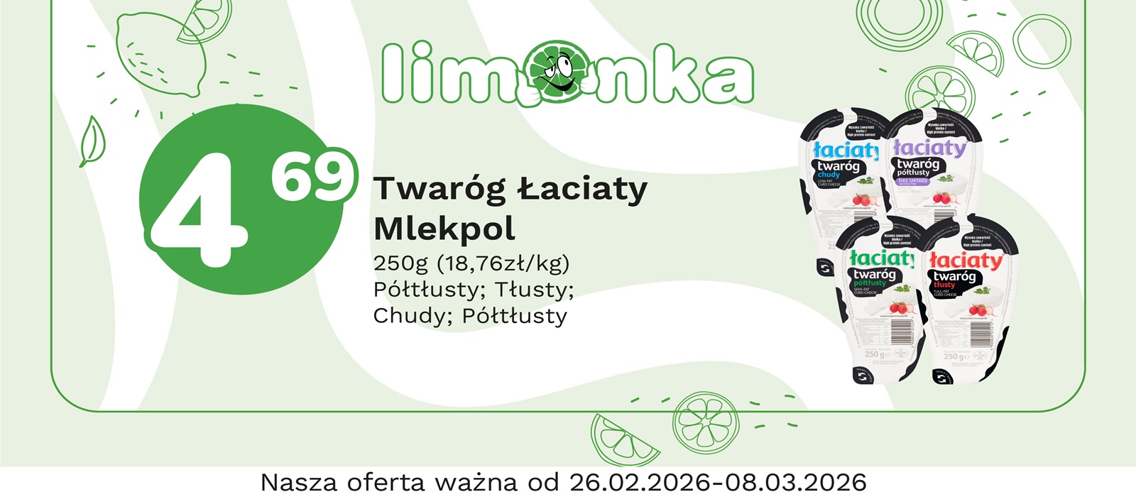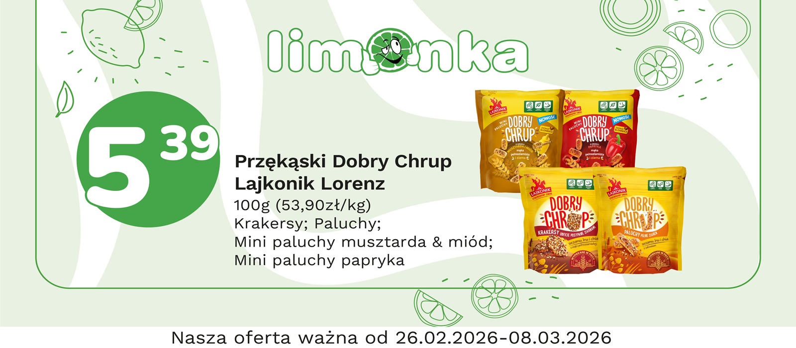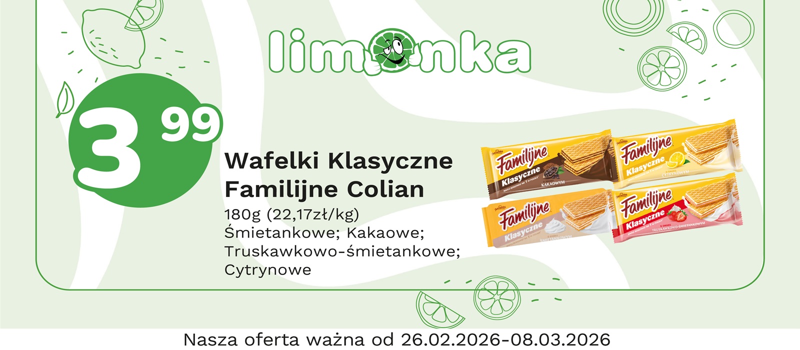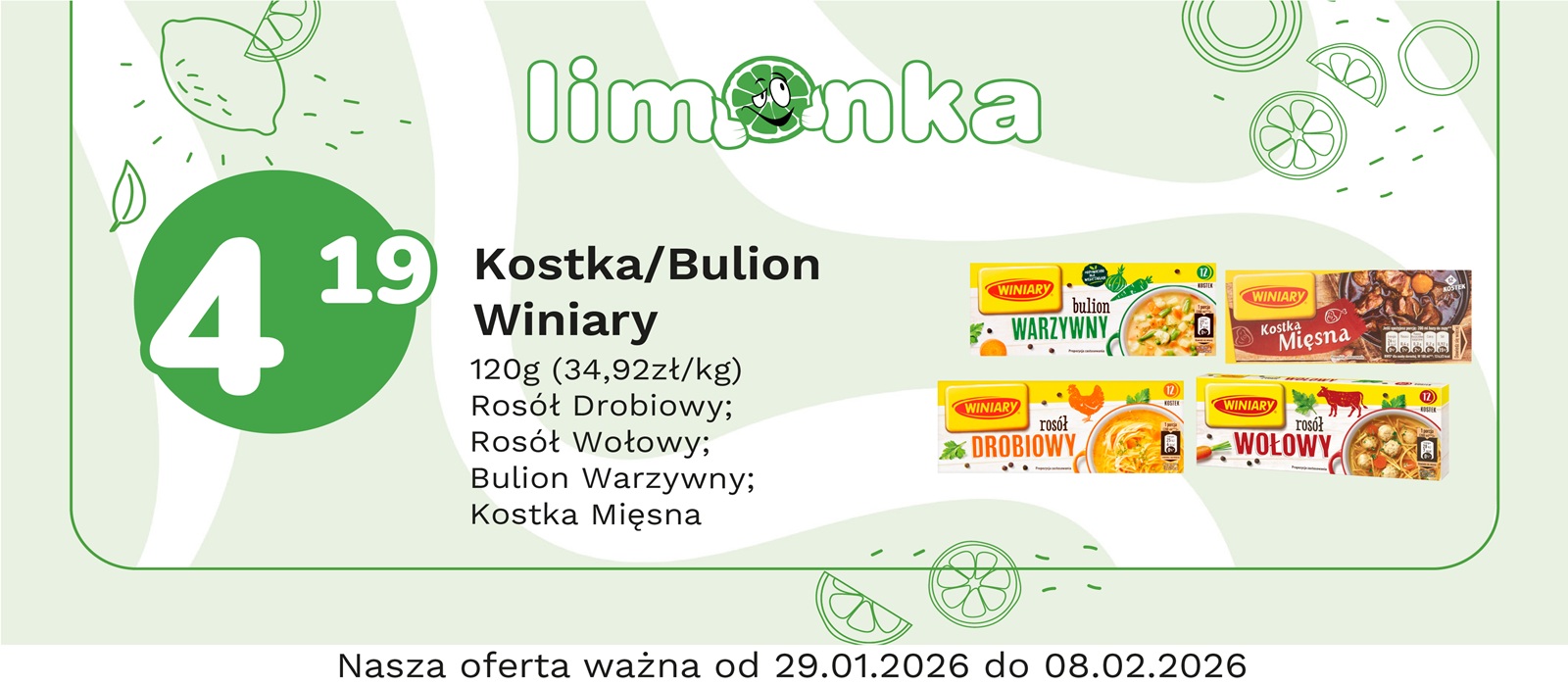 Limonka to w 100% polska sieć sklepów, prowadzona przez rodzimych przedsiębiorców. Oferujemy szeroki wybór świeżych produktów w atrakcyjnych cenach, dbając o ich najwyższą jakość. To miejsce, w którym codzienne zakupy stają się przyjemnością! Nasze sklepy są zawsze blisko Ciebie, oferując to, czego potrzebujesz na co dzień – korzystne ceny i różnorodny asortyment. Robiąc zakupy w Limonce, wybierasz komfort i pewność, że znajdziesz produkty idealne dla siebie i swoich bliskich.