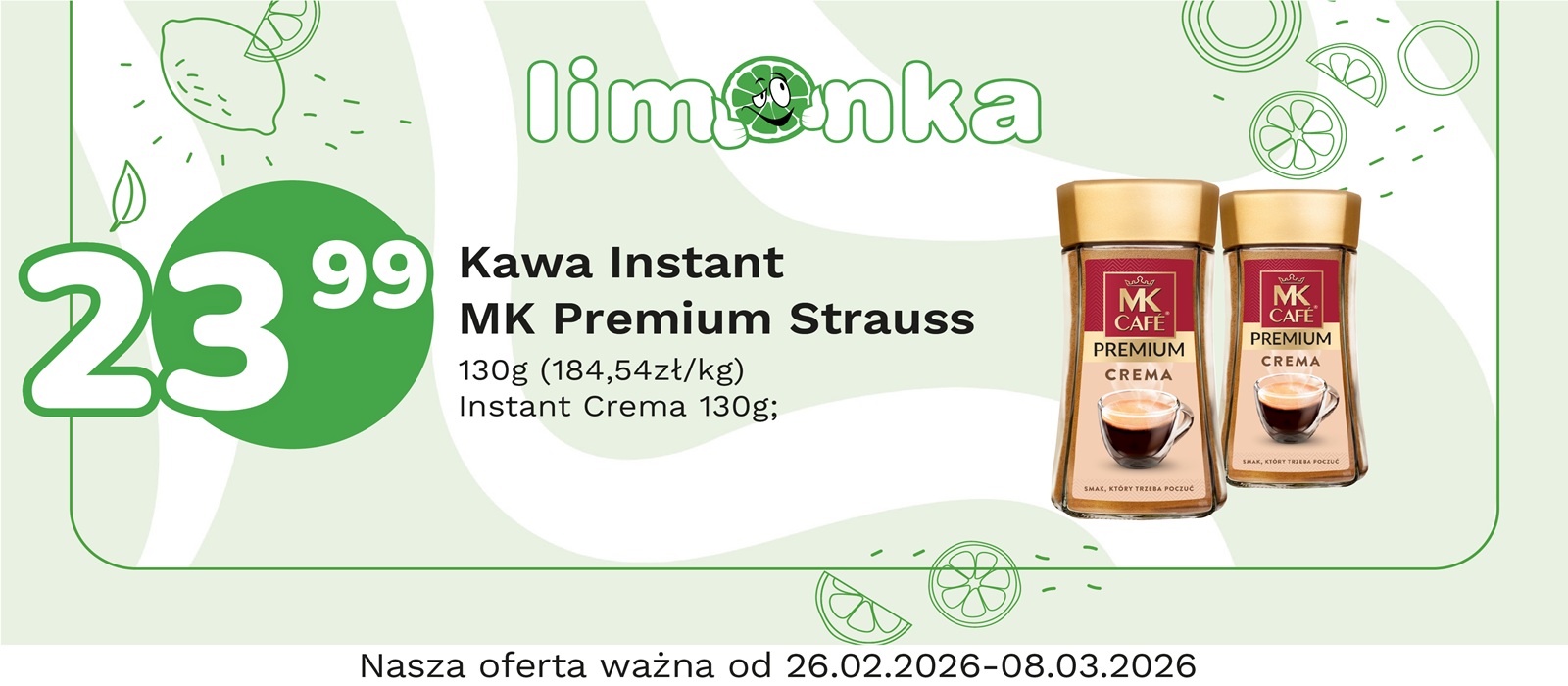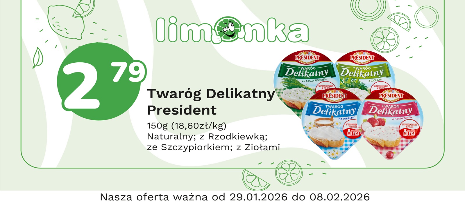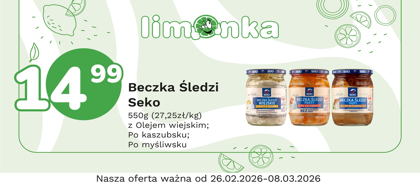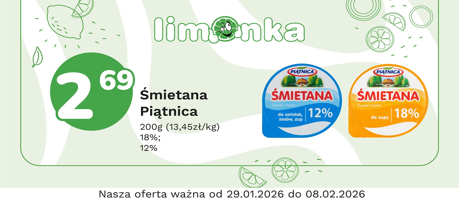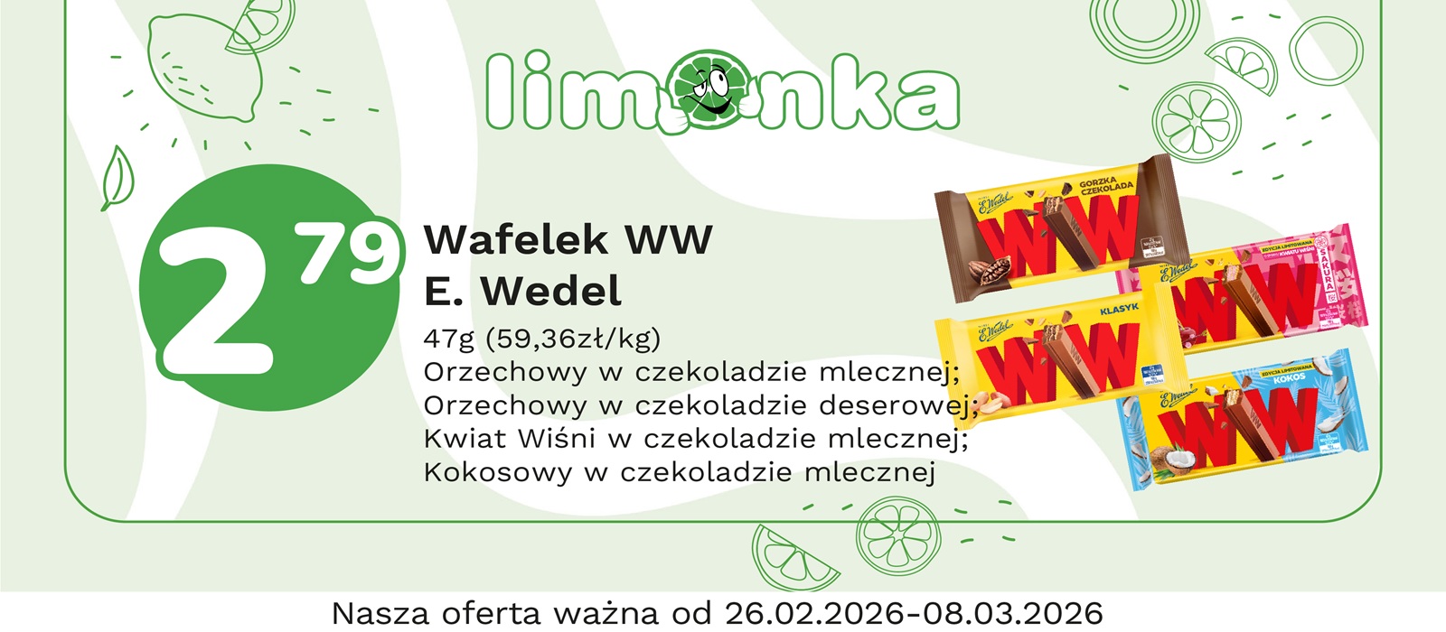 Limonka to w 100% polska sieć sklepów, prowadzona przez rodzimych przedsiębiorców. Oferujemy szeroki wybór świeżych produktów w atrakcyjnych cenach, dbając o ich najwyższą jakość. To miejsce, w którym codzienne zakupy stają się przyjemnością! Nasze sklepy są zawsze blisko Ciebie, oferując to, czego potrzebujesz na co dzień – korzystne ceny i różnorodny asortyment. Robiąc zakupy w Limonce, wybierasz komfort i pewność, że znajdziesz produkty idealne dla siebie i swoich bliskich.